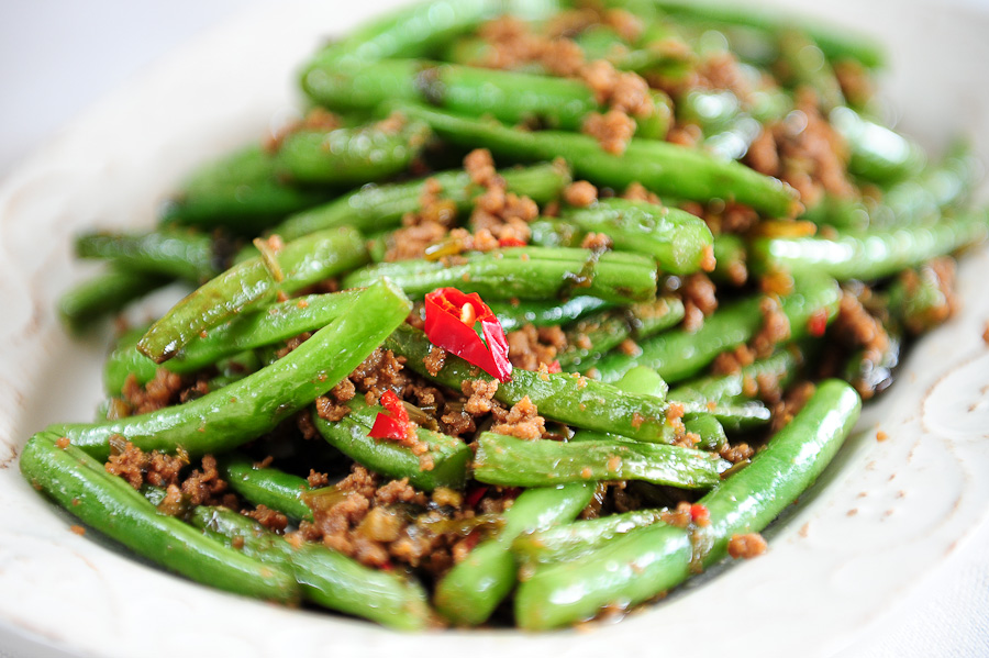 Najbardziej znane syczuańskie warzywne danie. Zielona fasolka jest smażona na sucho w woku aż delikatnie się pomarszczy. Nie znamy nikogo komu by ten sposób podania fasolki nie smakował.