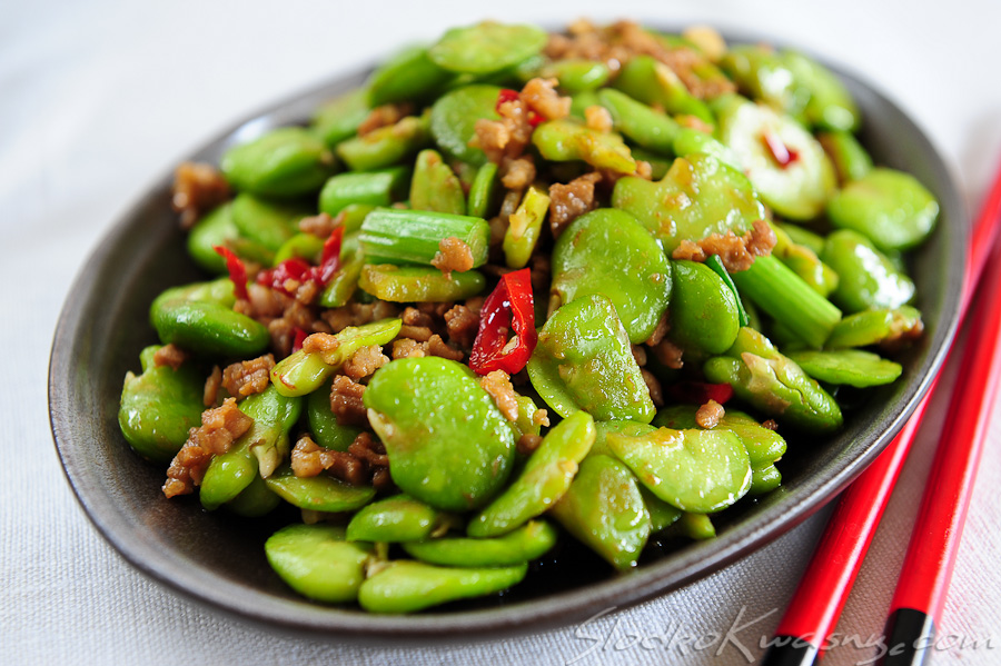 Rozgrzej wok na dużym ogniu, dodaj 2 łyżki oleju i rozprowadź na ściankach woka. Dodaj bób i smaż mieszając przez 2 minuty. Przełóż go na talerz.