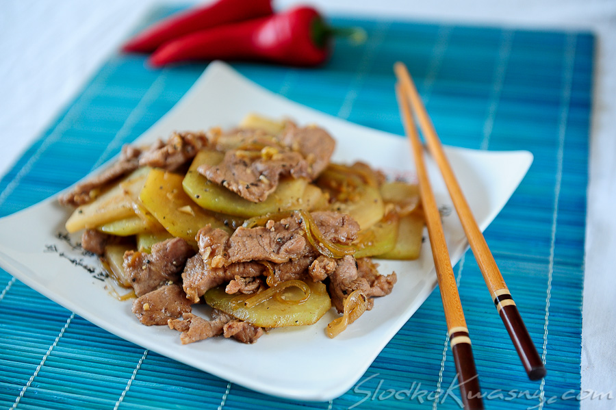 W woku smażymy na łyżce oleju i dużym ogniu połowę czosnku, cebulę i kalarepę około 2 minut. Odstawiamy na bok. Do woka dodajemy trochę oleju i smażymy z resztą czosnku wołowinę, około 2-3 minut. Dodajemy kalarepę i sosy: sojowy, rybny i ostrygowy. Smażymy jeszcze około 2 minut.
