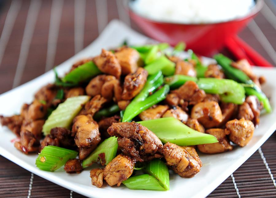 Smażenie ‘do sucha’ jest sposobem na wiele syczuańskich dań. Pozbawia on mięsa nadmiaru wody przez co robi się ono chrupiące ale nie suche i twarde! Jeżeli dodać do tego świeże warzywa – rezultat jest wyśmienity. My proponujemy seler naciowy i szczypiorek, można zastąpić go zieloną papryką (jeżeli zdecydujecie się na paprykę, usmażcie ją osobno aż do miękkości używając trochę soli i oleju i dopiero dodajcie mięso).