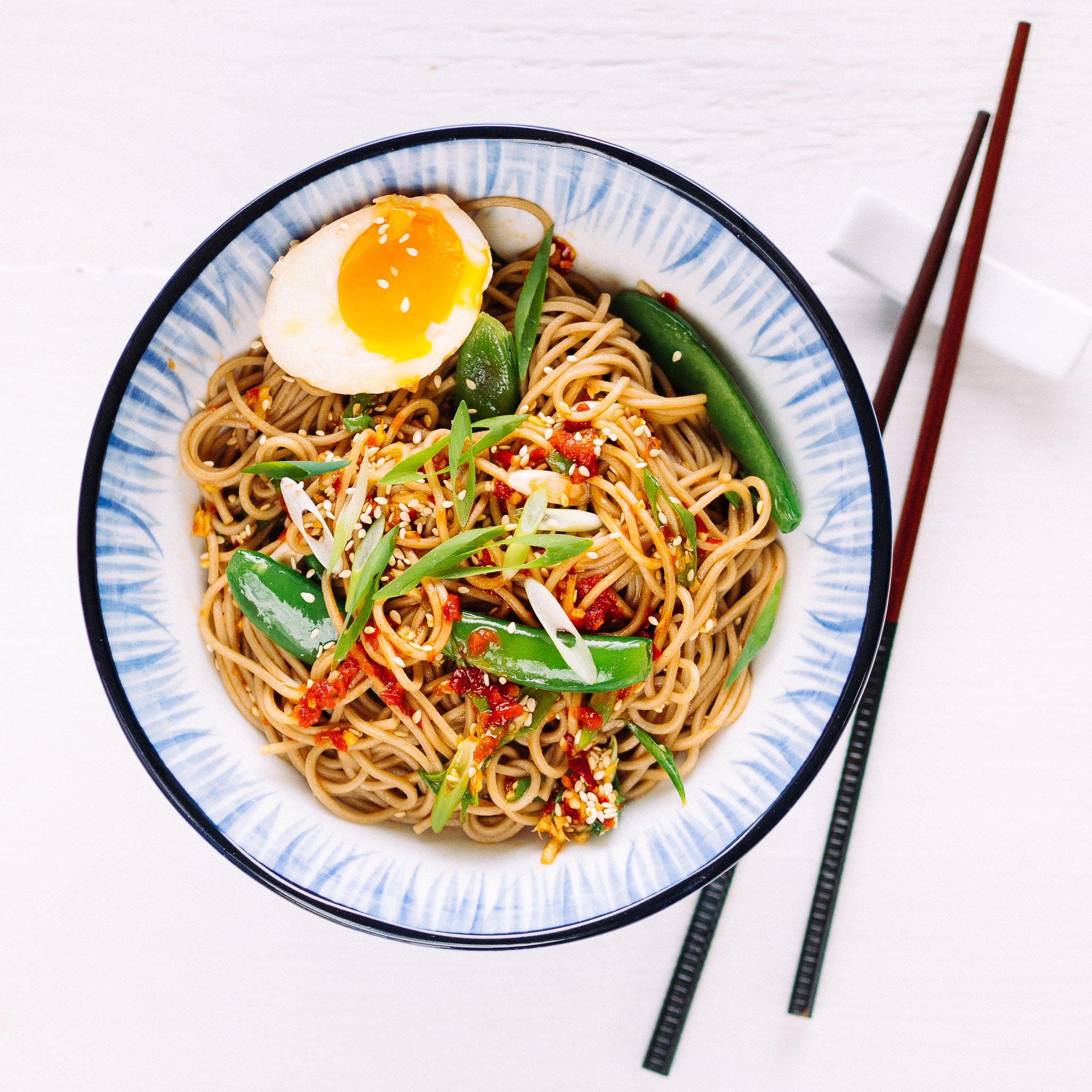 Produkty użyte w tym przepisie: makaron soba, olej sezamowy, mirin, japoński sos sojowy, sambal oelek, biały sezam