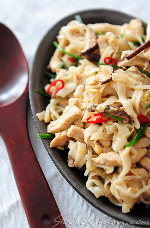 Makaron ryżowy, suszone grzyby, trochę warzyw i pyszne autentyczne chińskie danie gotowe. Składniki na pewno znajdziesz w swojej kuchni, tym bardziej że kurczaka można z powodzeniem zastąpić wieprzowiną, makaron ryżowy chińskim makaronem jajecznym a jeżeli masz ochotę na wegetariańskie danie, możesz użyć tylko grzybów (zastosuj kilka rodzajów) i warzyw.