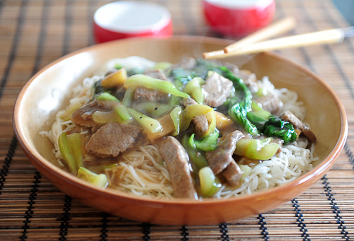 Dodaj pozostały olej słonecznikowy do woka, rozgrzej go i dodaj imbir. Smaż aż do uzyskania wyraźnego aromatu. Dodaj wieprzowinę i podsmaż dokładnie aż mięso zmięknie. Dodaj łodygi bok choy’a a po minucie liście. Dodaj sos przygotowany wcześniej.