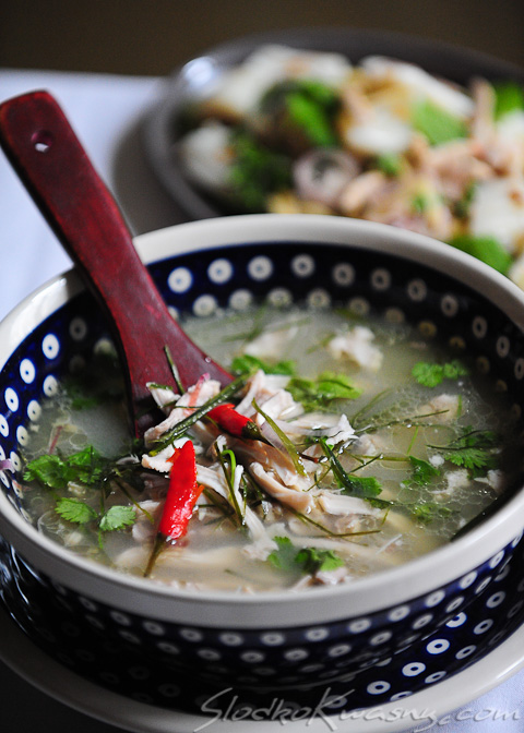 Tą dzisiejszą, zwaną po tajsku dtom jiw gai, możemy śmiało nazwać tajskim rosołem, chociaż u nas pojawia się bez makaronu. Jeżeli jednak miałoby to być jedyne danie, można z powodzeniem dodać trochę makaronu z fasoli mung. My ją podaliśmy z tajską sałatką z kalmara, co nam starczyło na spory syty obiad.