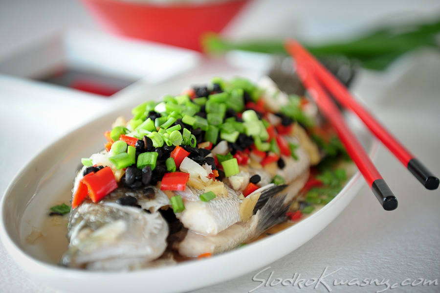 Natnij wypatroszoną rybę w siatkę i zamarynuj w paprykaczkach, imbirze, czosnku i czarnej soi – odstaw do lodówki na 20 minut. Ugotuj ją na parze (my użyliśmy piekarnika parowego, można to jednak zrobić też na patelni z przykrywką, wlewając na dno wodę i stawiając rybę na talerzu). Po kilkunastu minutach ryba powinna być gotowa.
