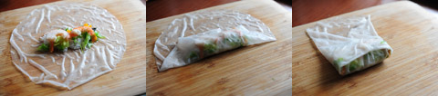 Posmaruj 3 rogi placków żółtkiem, dodaj 2 łyżki mieszaniny ukośnie na środek placka (od jednego rogu posmarowanego żółtkiem, do drugiego rogu posmarowanego żółtkiem). Zawiń oba te rogi na miksturę, następnie nałóż na to róg nieposmarowany żółtkiem i zawiń sajgonki (na końcu powinien się znaleść ostatni róg posmarowany żółtkiem).