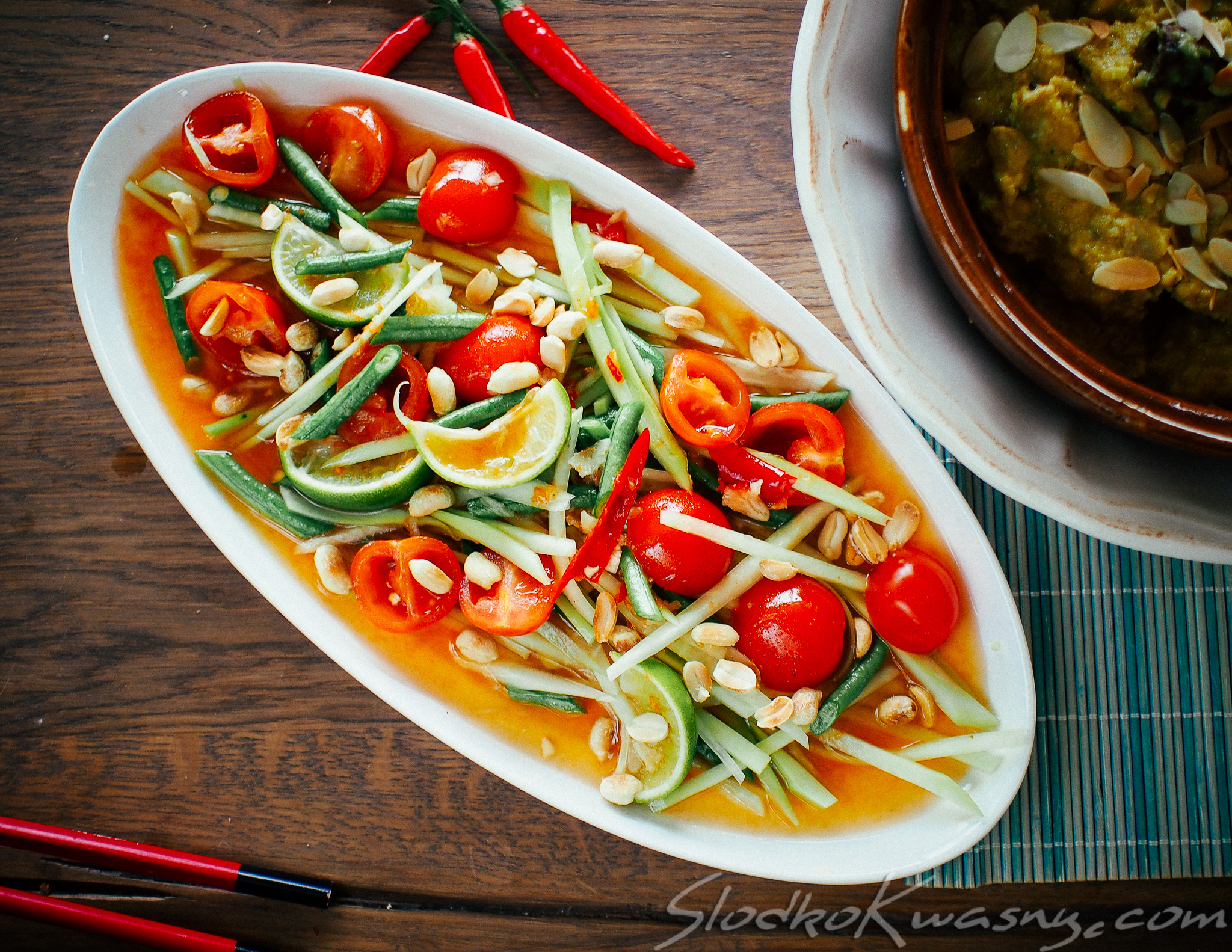 Som Tam to klasyk kuchni tajskiej. Pełny tajskich smaków: cukru palmowego, kwaśnego soku z limonki i tamaryndu, ostrego chili i słonego sosu rybnego. To wszystko idealnie łączy się z kruchą papają. Ciekawostką jest że sałatka prawdopodobnie pochodzi z Laosu.