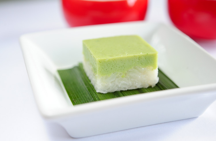 Ryż zalewamy wodą i mleczkiem kokosowym (w sumie wody i mleczka powinno być kilka milimetrów ponad poziom ryżu) z łyżeczką soli i liściem pandanu i stawiamy na parze. Na ostrym ogniu parujemy 25 minut. Zabieramy liść pandanu wzruszamy ryż widelcem i gotujemy na parze dalsze 10 minut. Teraz ryż powinien być szklisty – ubijamy na płasko dużą łyżką.