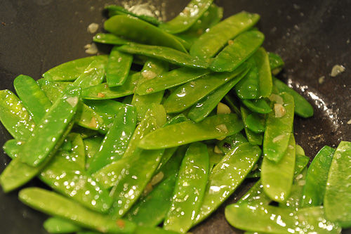 Opłucz groszek, odetnij końce i usuń twarde włókna. Podgrzej woka na ogniu, wlej olej, jak już będzie gorący dodaj czosnek, smaż mieszając kilkadziesiąt sekund, dodaj groszek i sól, smaż następną chwilę mieszając, dodaj sos sojowy i smaż mieszając kolejną minutę (całkowity czas smażenia to około 2 minuty).