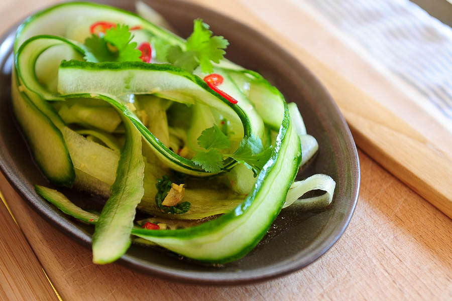 Zrobiłam kiedyś tajską sałatkę z ogórka, ale w nieco innej wersji. Ta mi się bardzo podoba, w szczególności sposób pokrojenia ogórka – bardzo efektownie wygląda.
