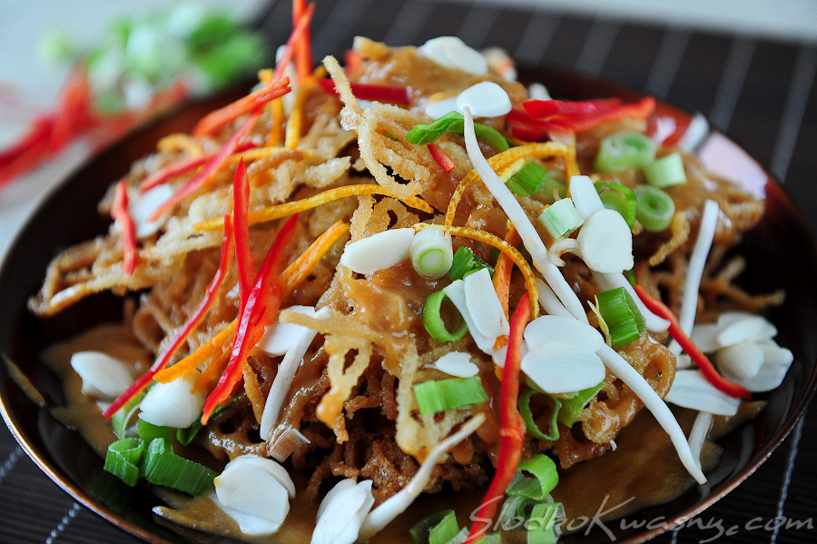 Przygotuj makaron wg przepisu na opakowaniu (jeżeli jest cienki zazwyczaj moczy się go w gorącej wodzie przez 10 minut). Odsącz i zmieszaj z rozbitym jajkiem i pozostaw do wyschnięcia na całą noc. Jest to konieczne by danie zyskało swój charakterystyczny chrupki charakter.