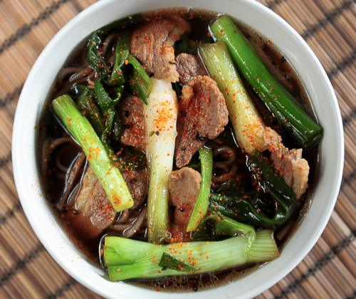 Zrób wywar dashi wg przepisu na opakowaniu, doprowadź do wrzenia i dodaj sos sojowy i mirin. Doprowadź ponownie do wrzenia i dodaj kaczkę i znowu zagotuj usuwając szum z powierzchni jeżeli się pojawi. Sprawdź czy kaczka jest dostatecznie miękka (my gotowaliśmy jeszcze około 3-4 minuty). Dodaj szczypiorek i gotuj jeszcze 1-2 minuty.